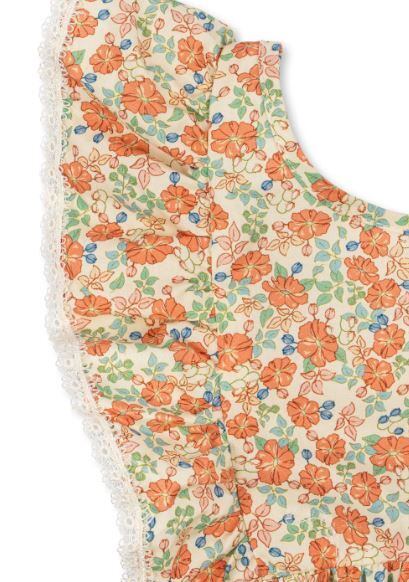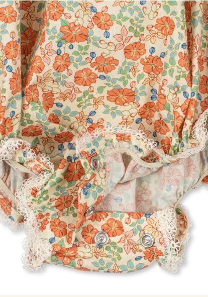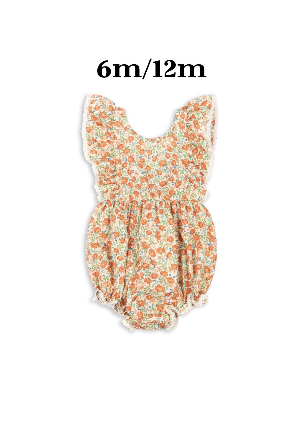フリルストラップと背中のローVカットがデザインされたロンパース。