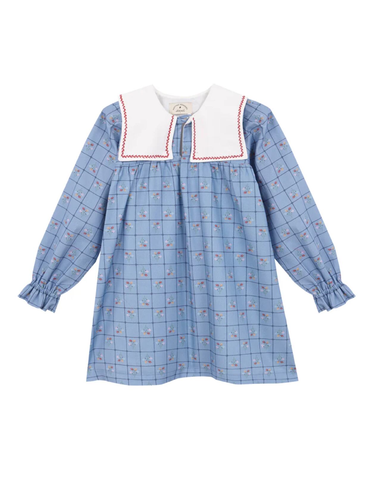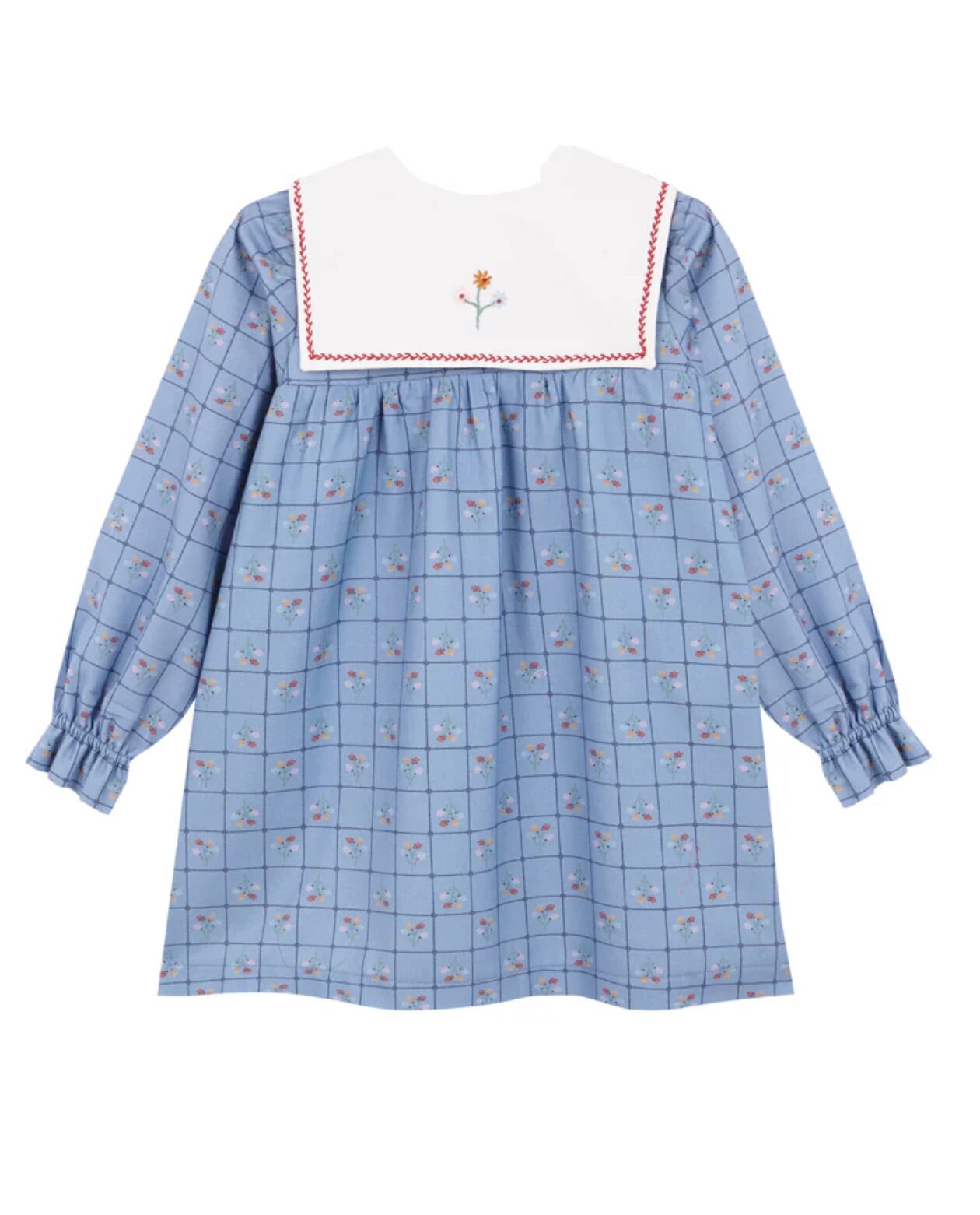 ビッグカラーに赤のアクセント刺繍がおしゃれで目を引くデザインになっています。また、後ろ襟にお花の刺繍があり、後ろ姿まで可愛いです。
