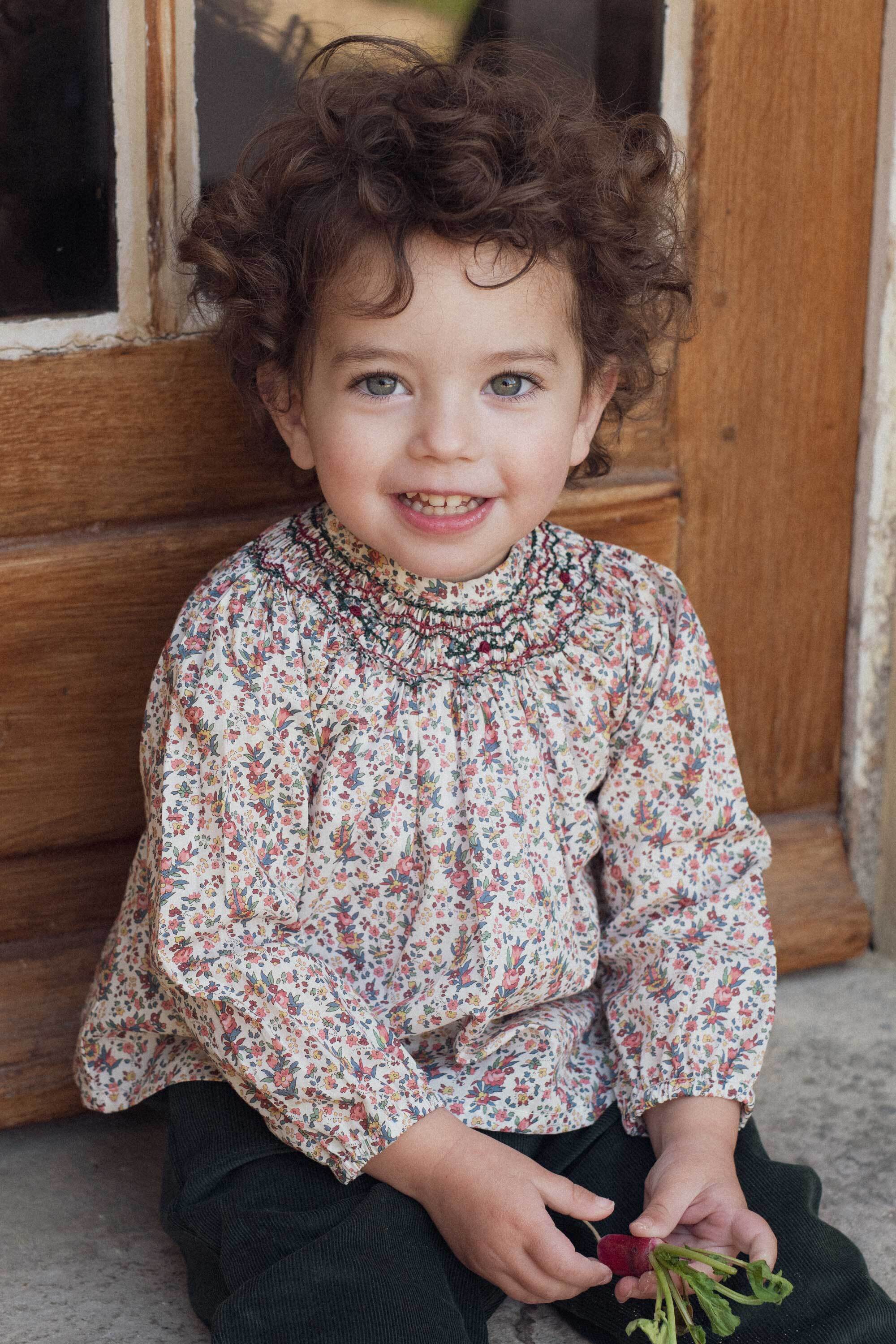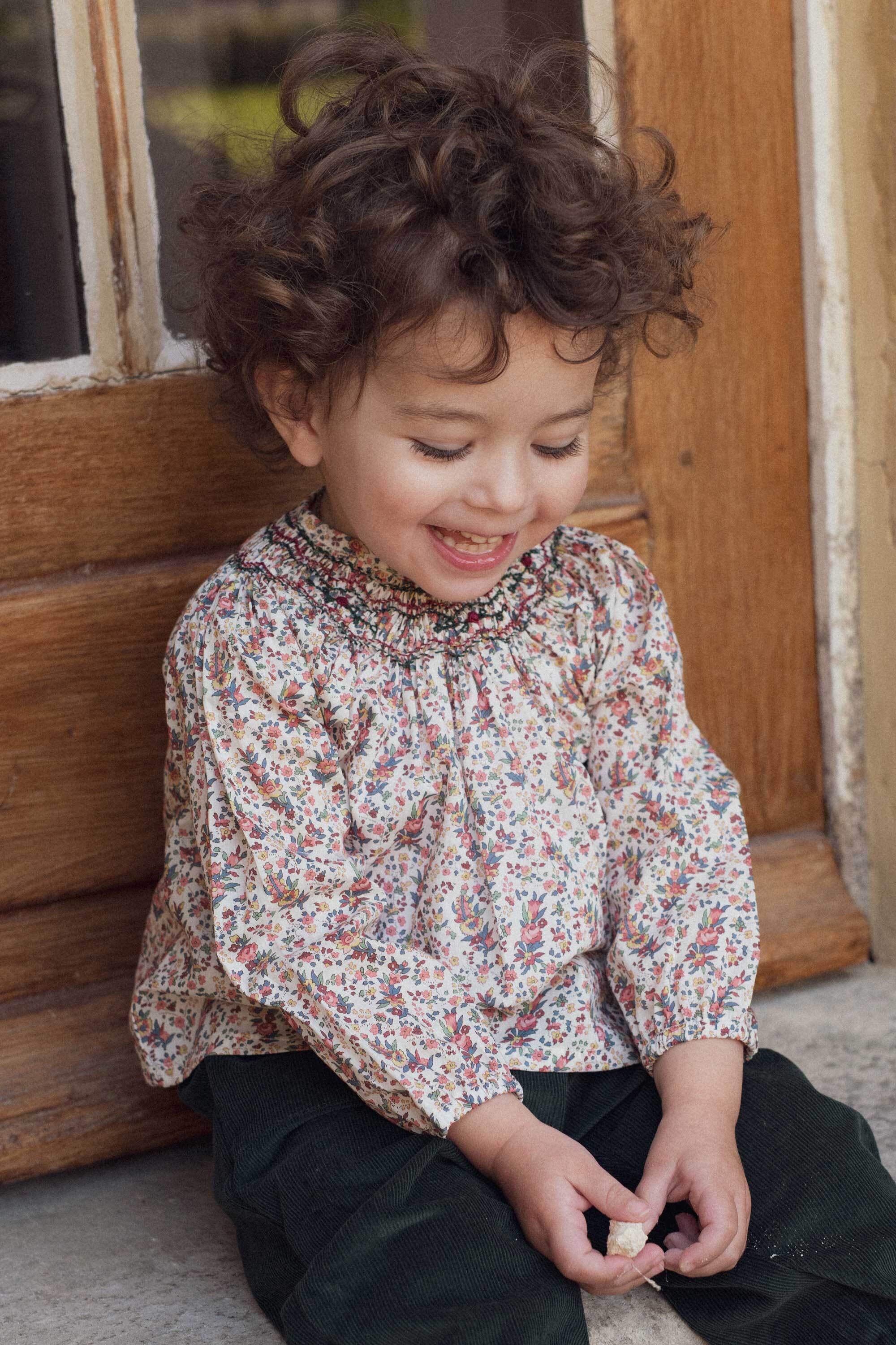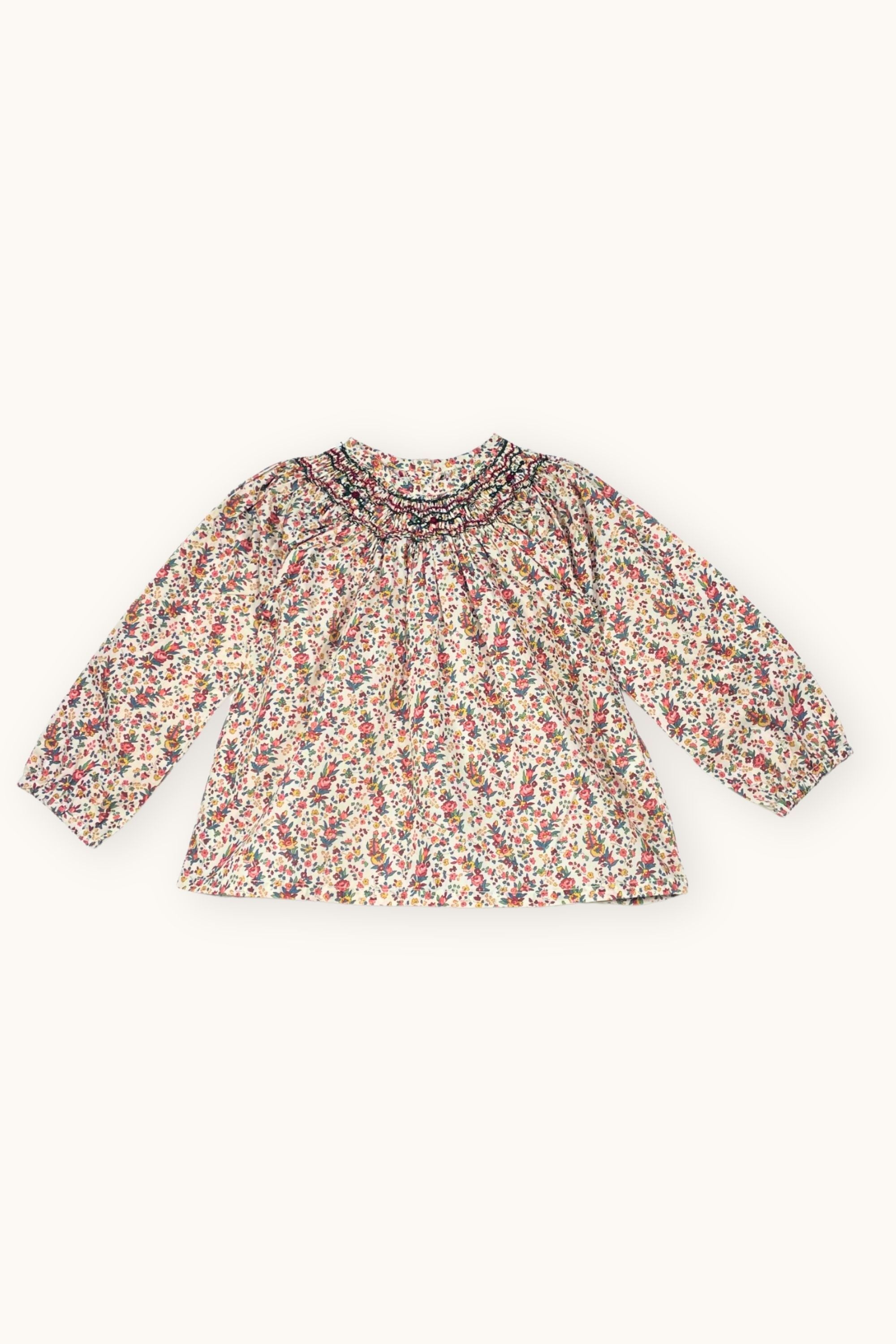 リバティ柄のブラウスで襟元に手作業で仕立てられたスモックや手刺繍のお花がおしゃれなブラウス。