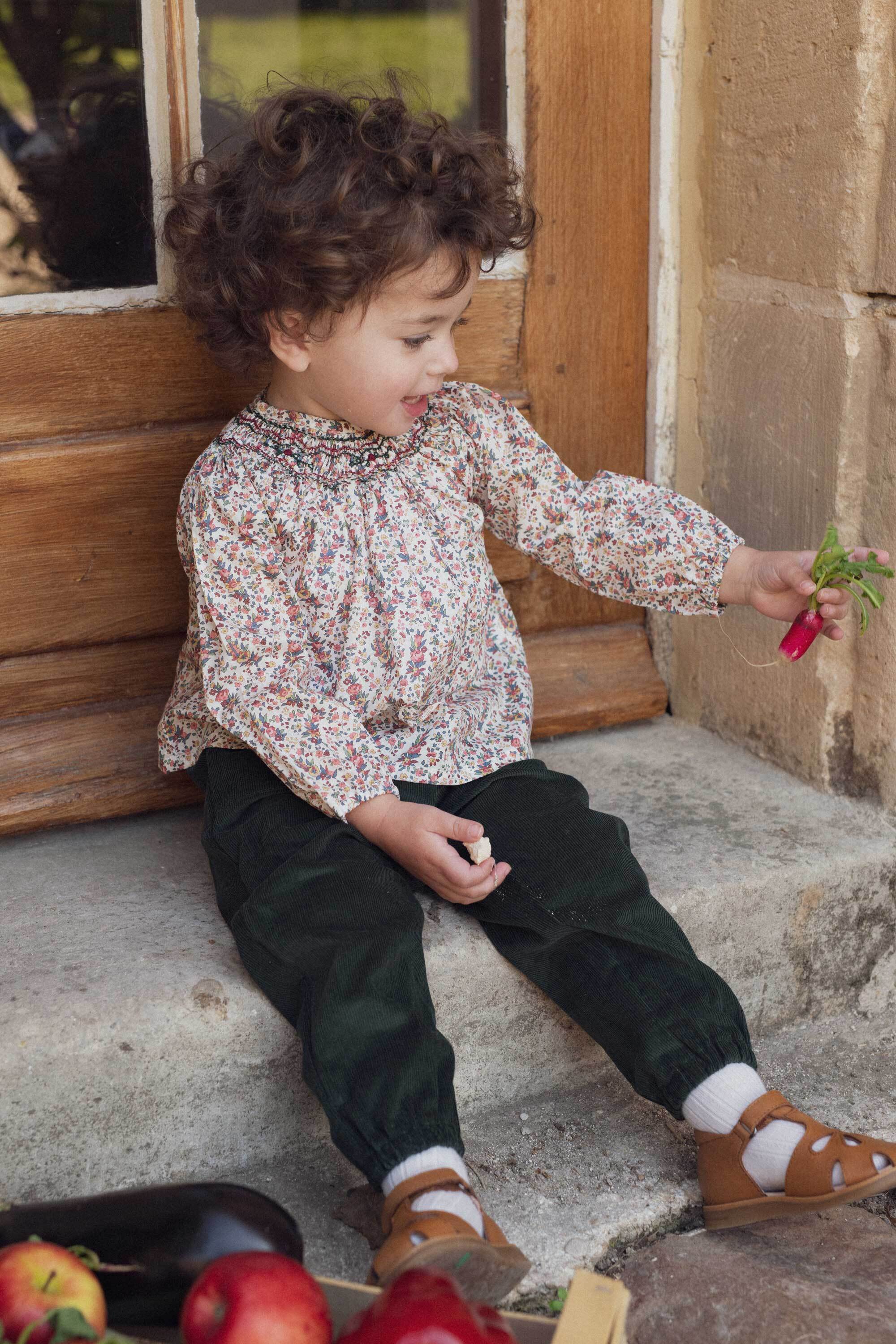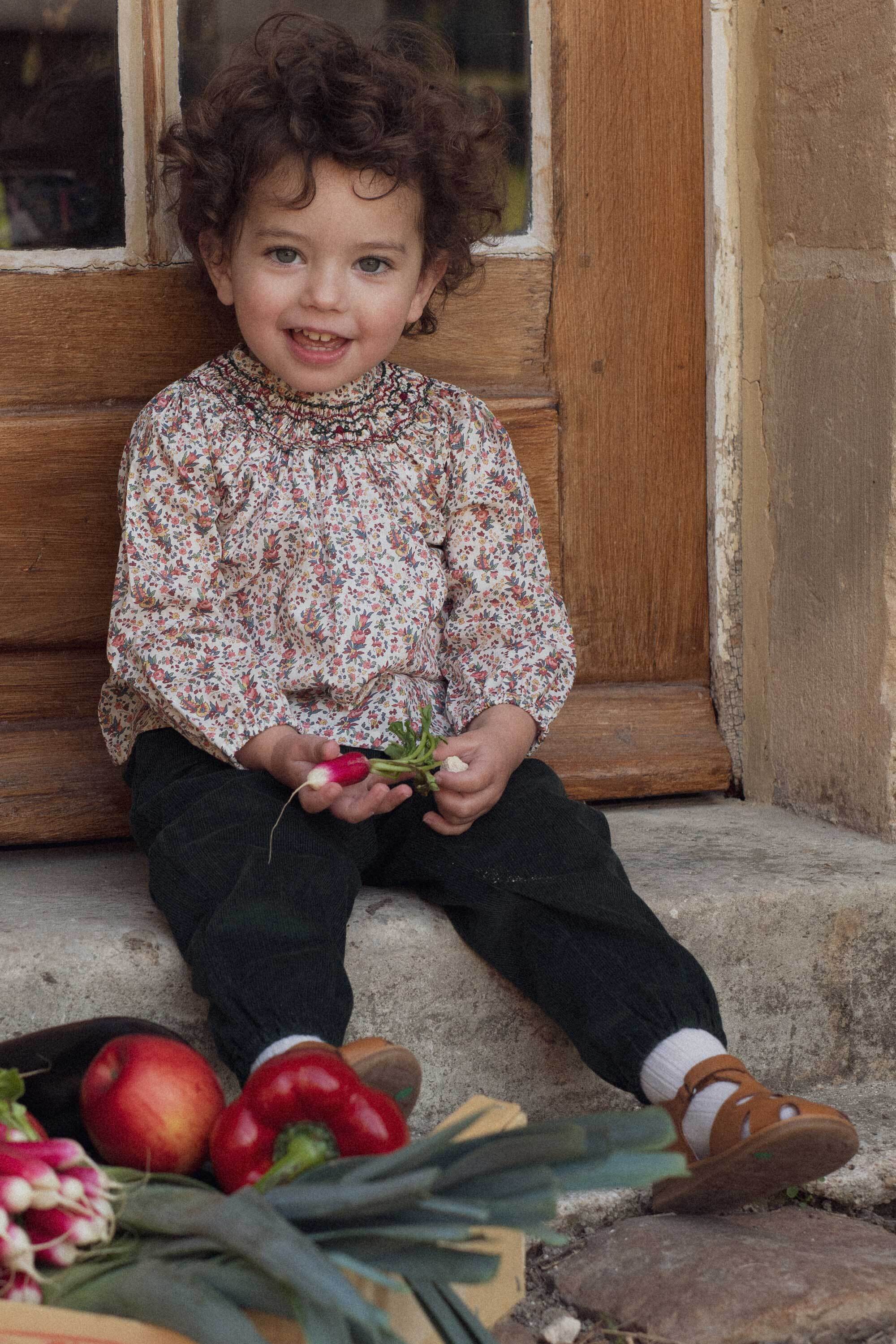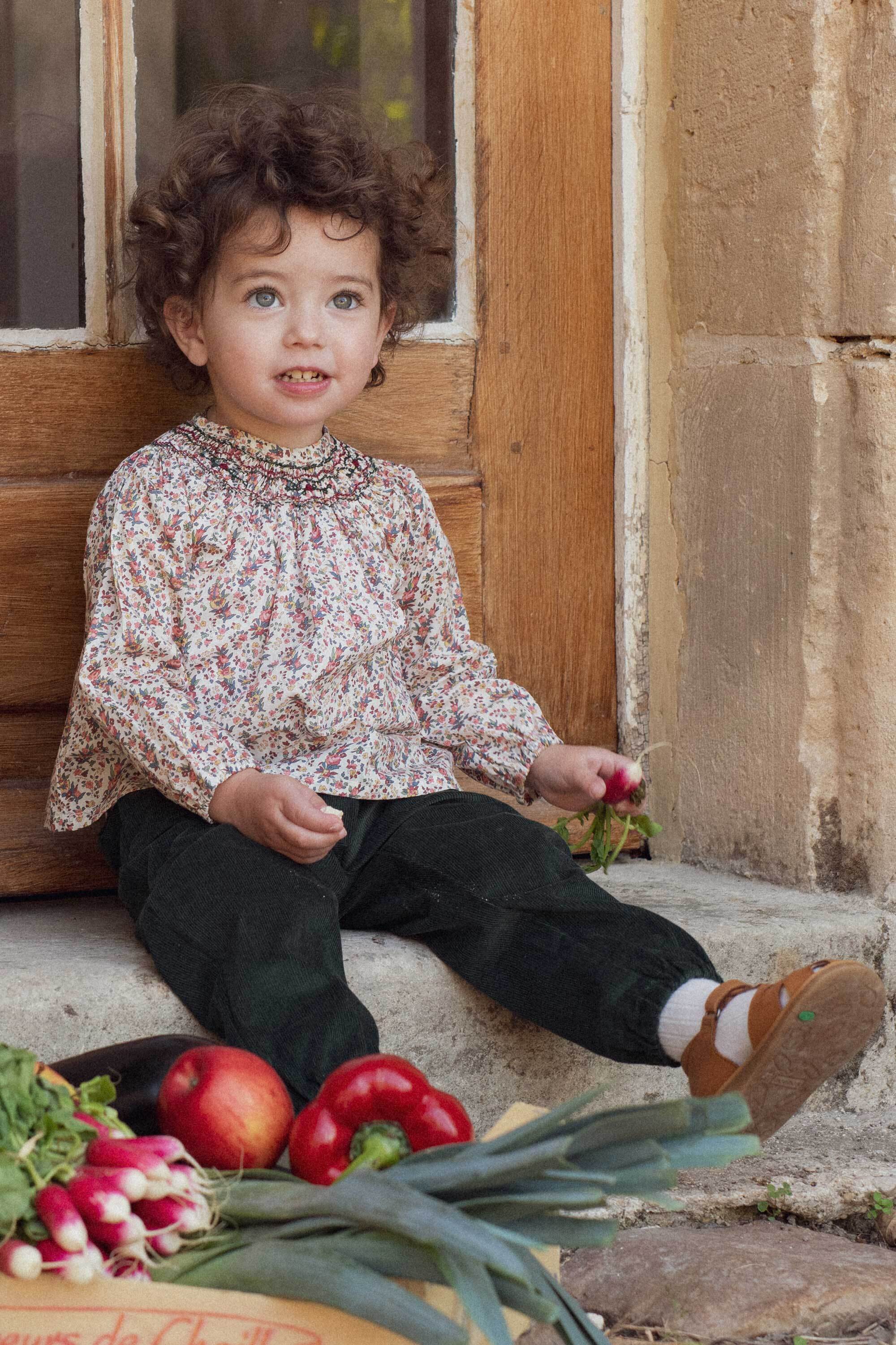 リバティ柄のブラウスで襟元に手作業で仕立てられたスモックや手刺繍のお花がおしゃれなブラウス。