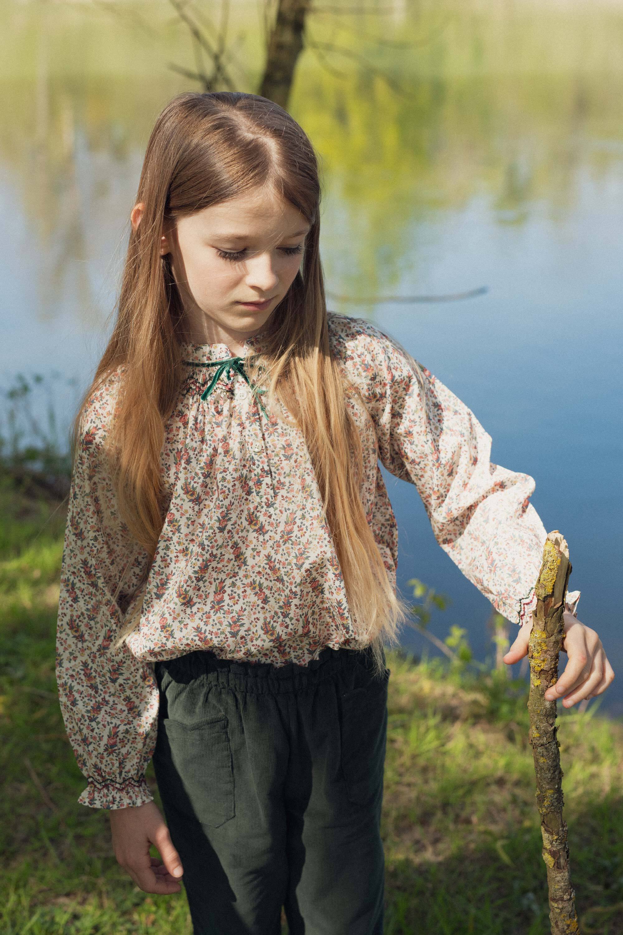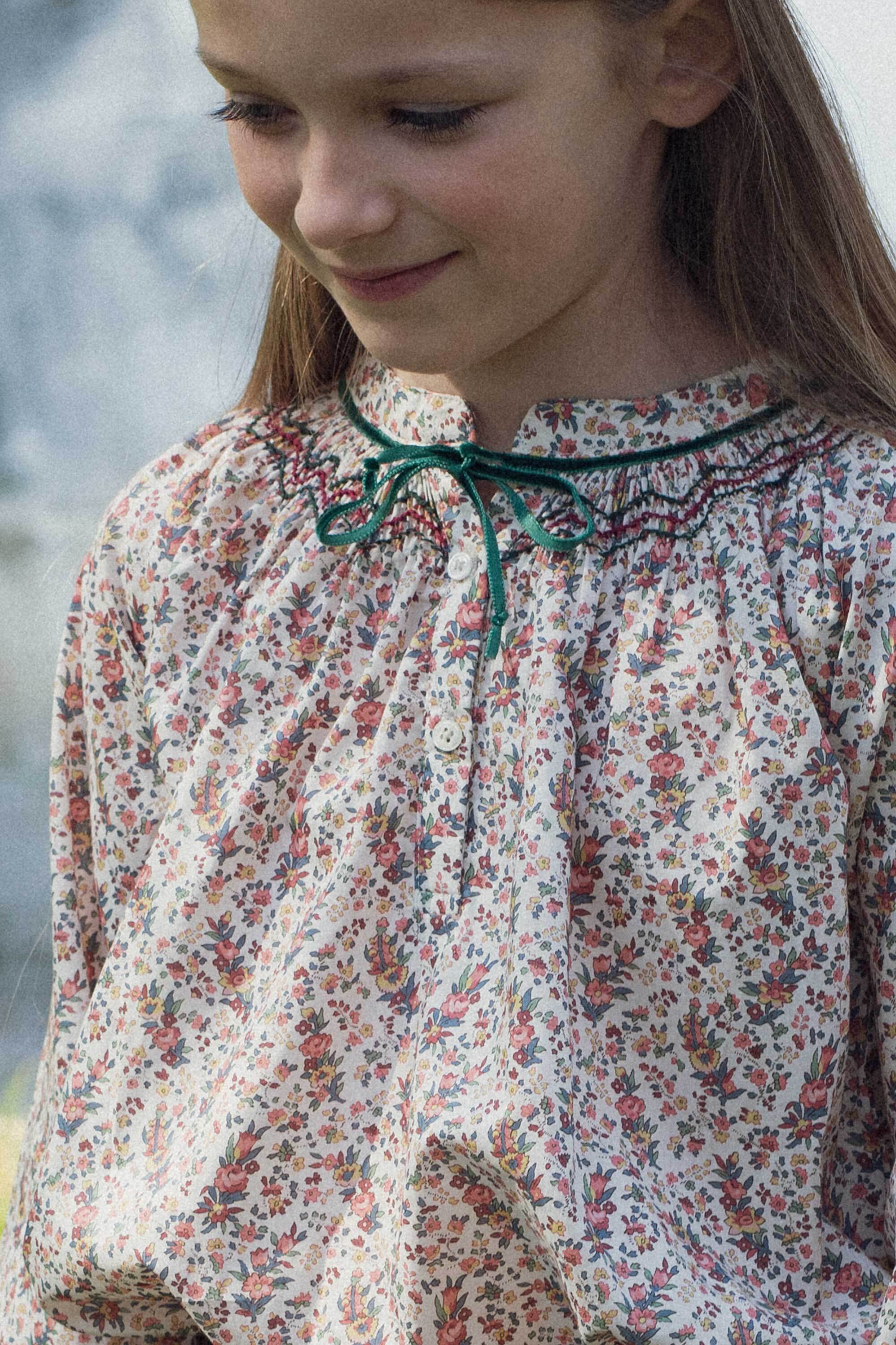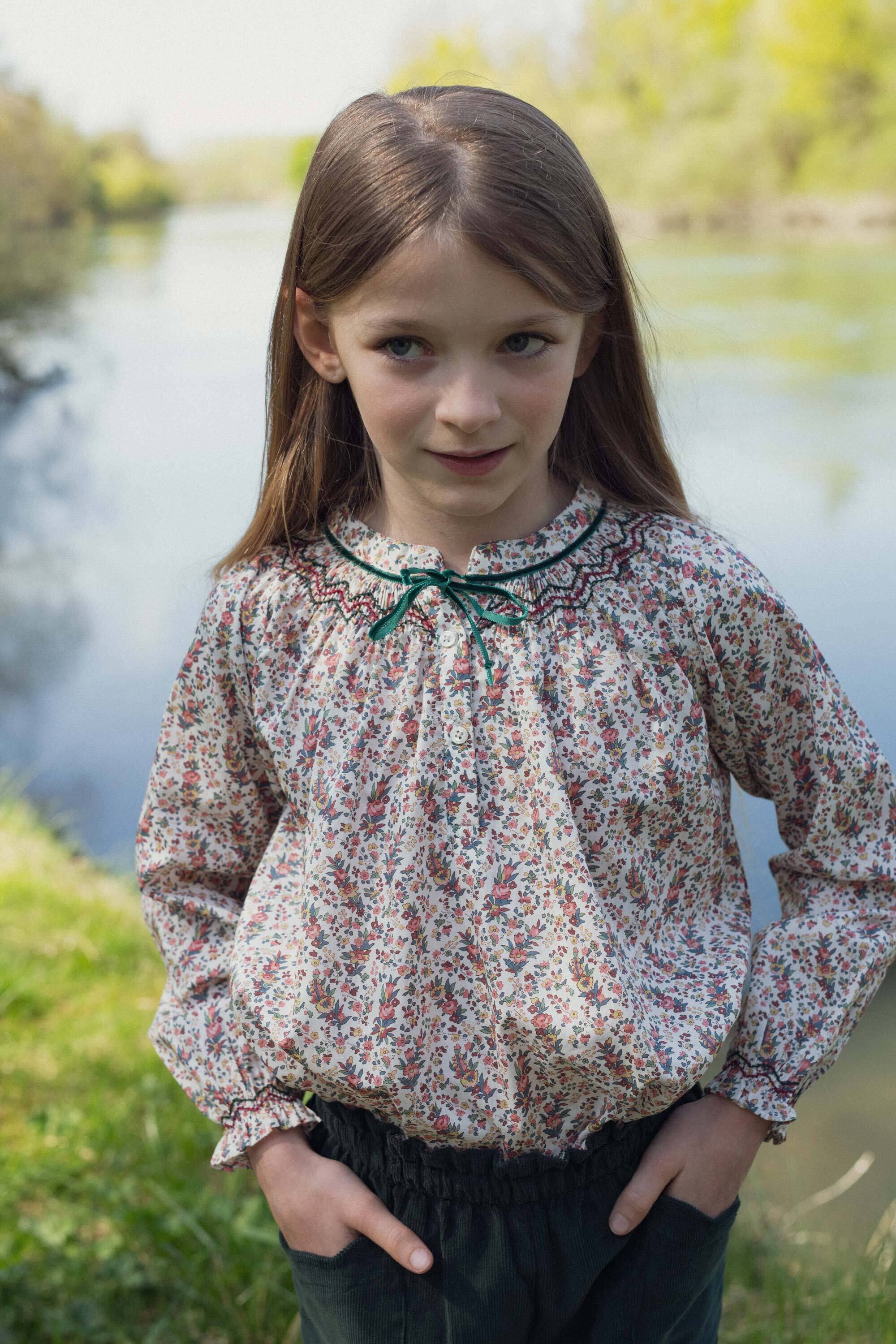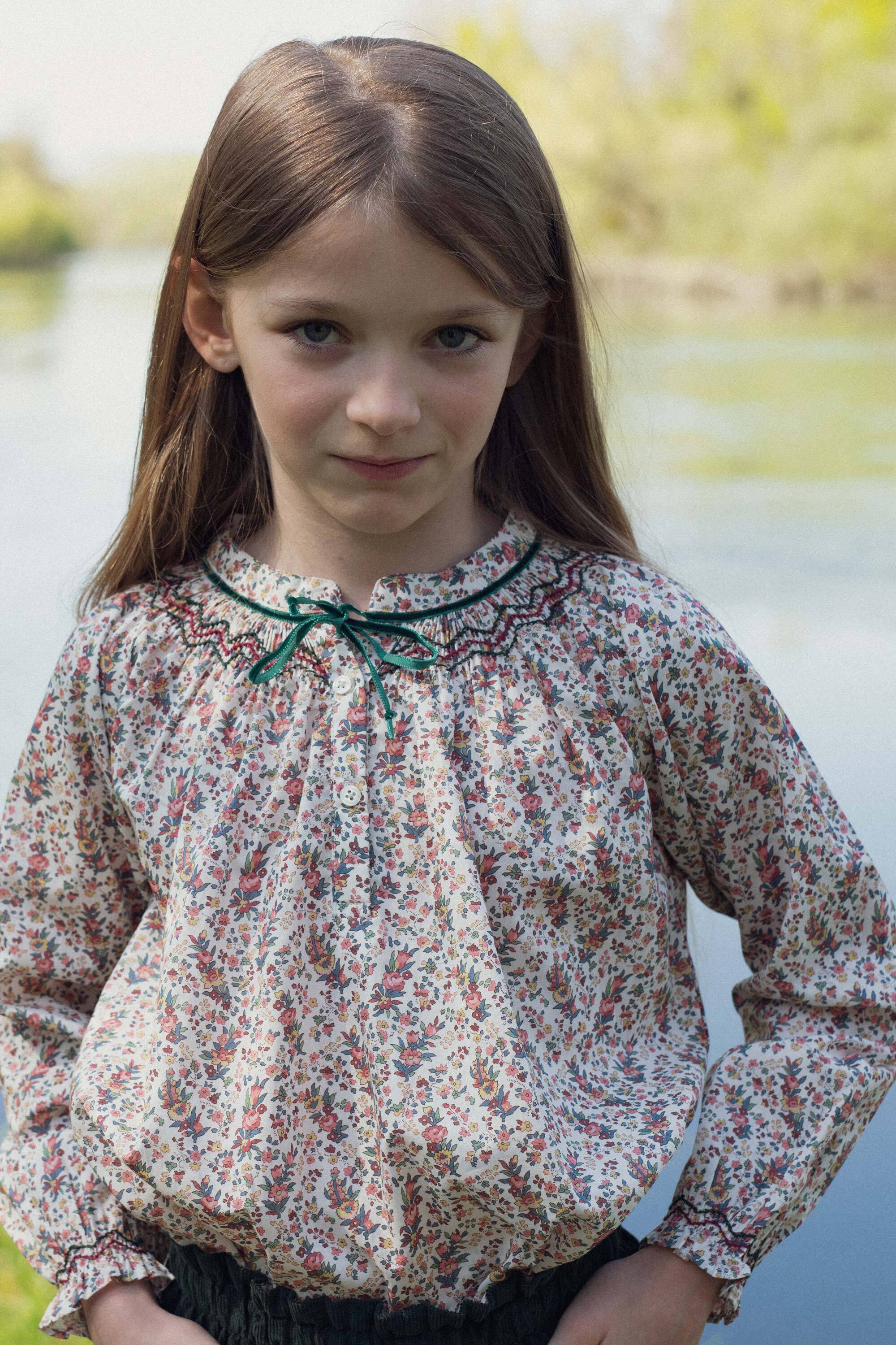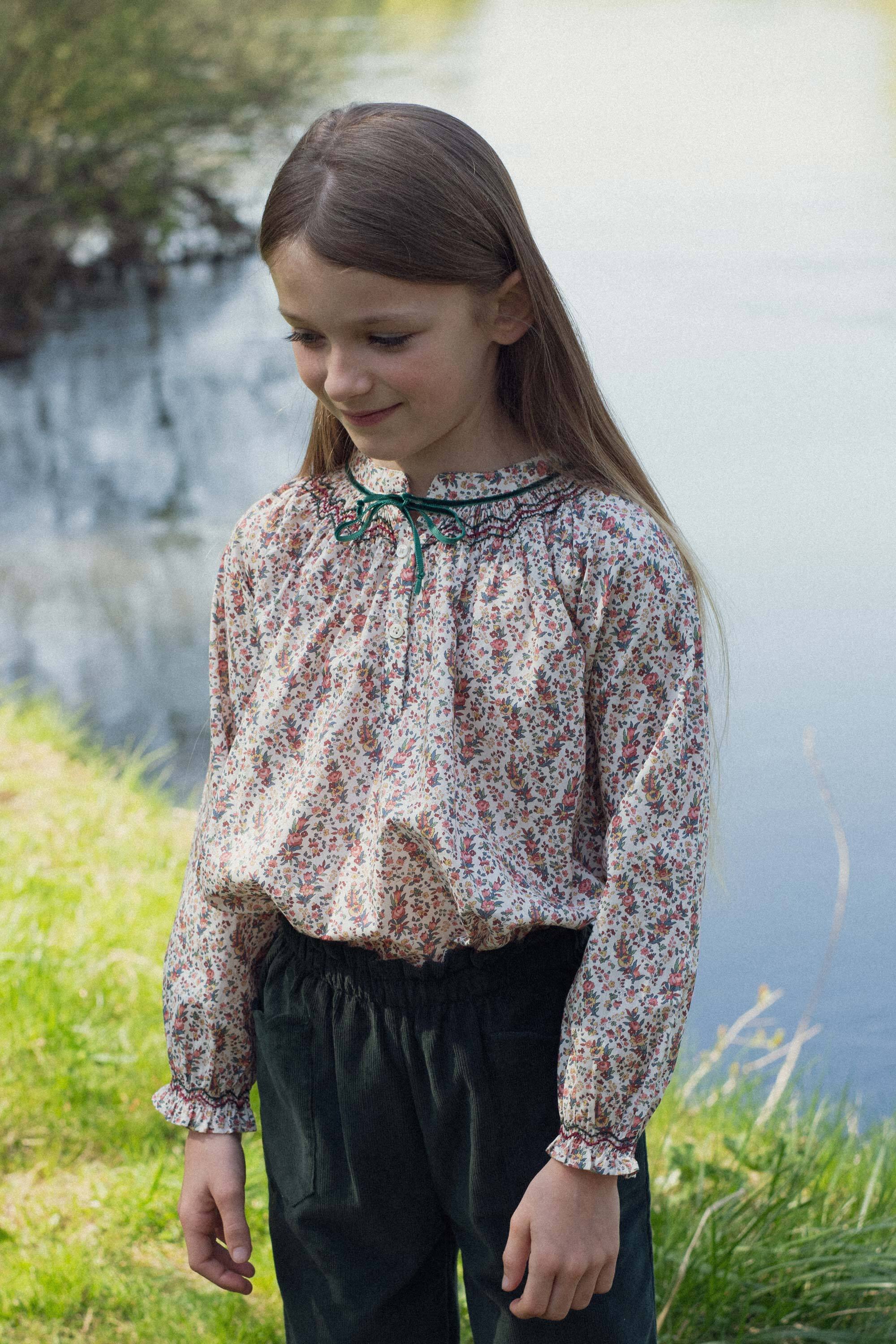 リバティ柄のブラウスで襟元や袖部分の手刺繍やネックラインのベルベットリボンがとてもおしゃれでこだわりが詰まっています。