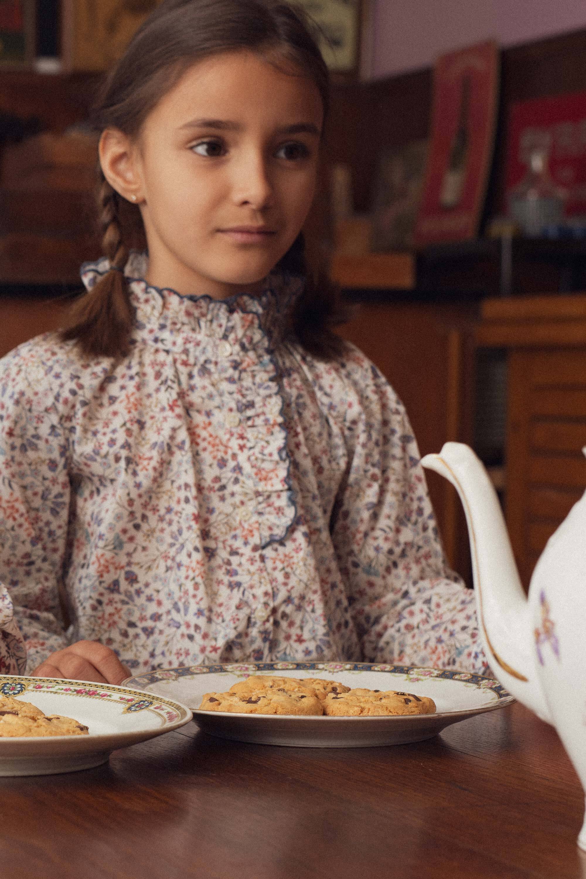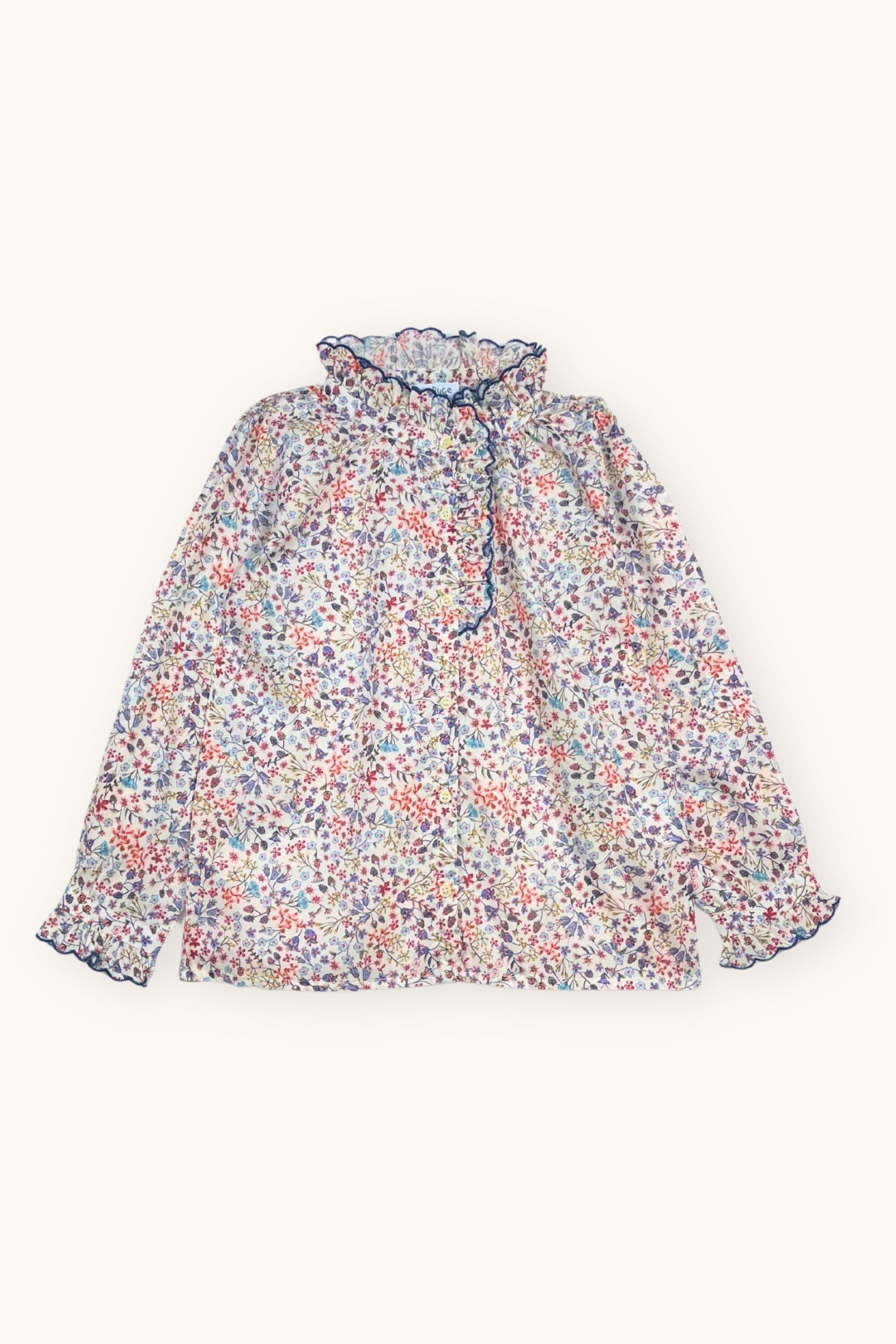 ブルトンステッチで仕上げたフリルハイカラ―のリバティ柄のブラウス。