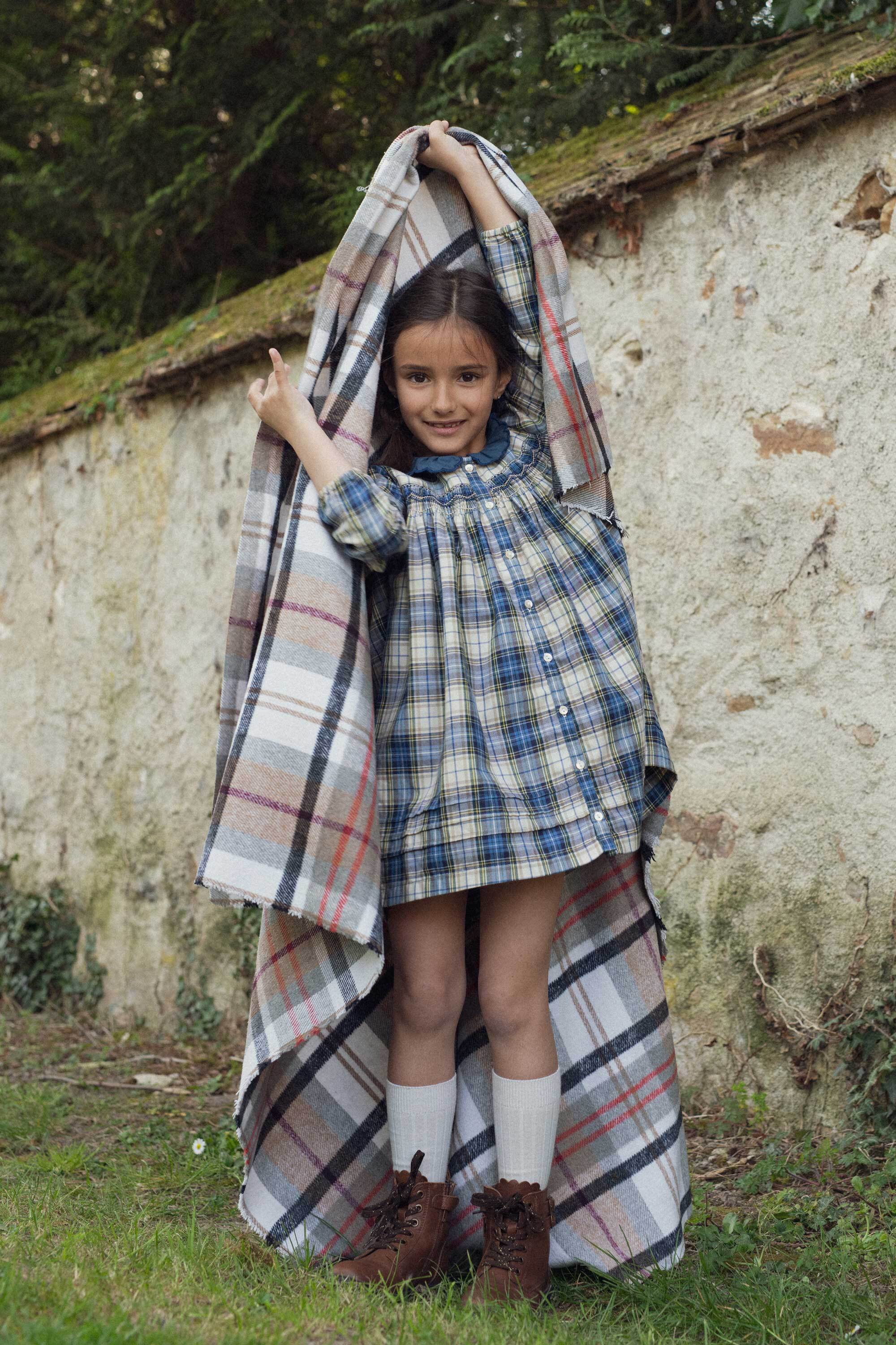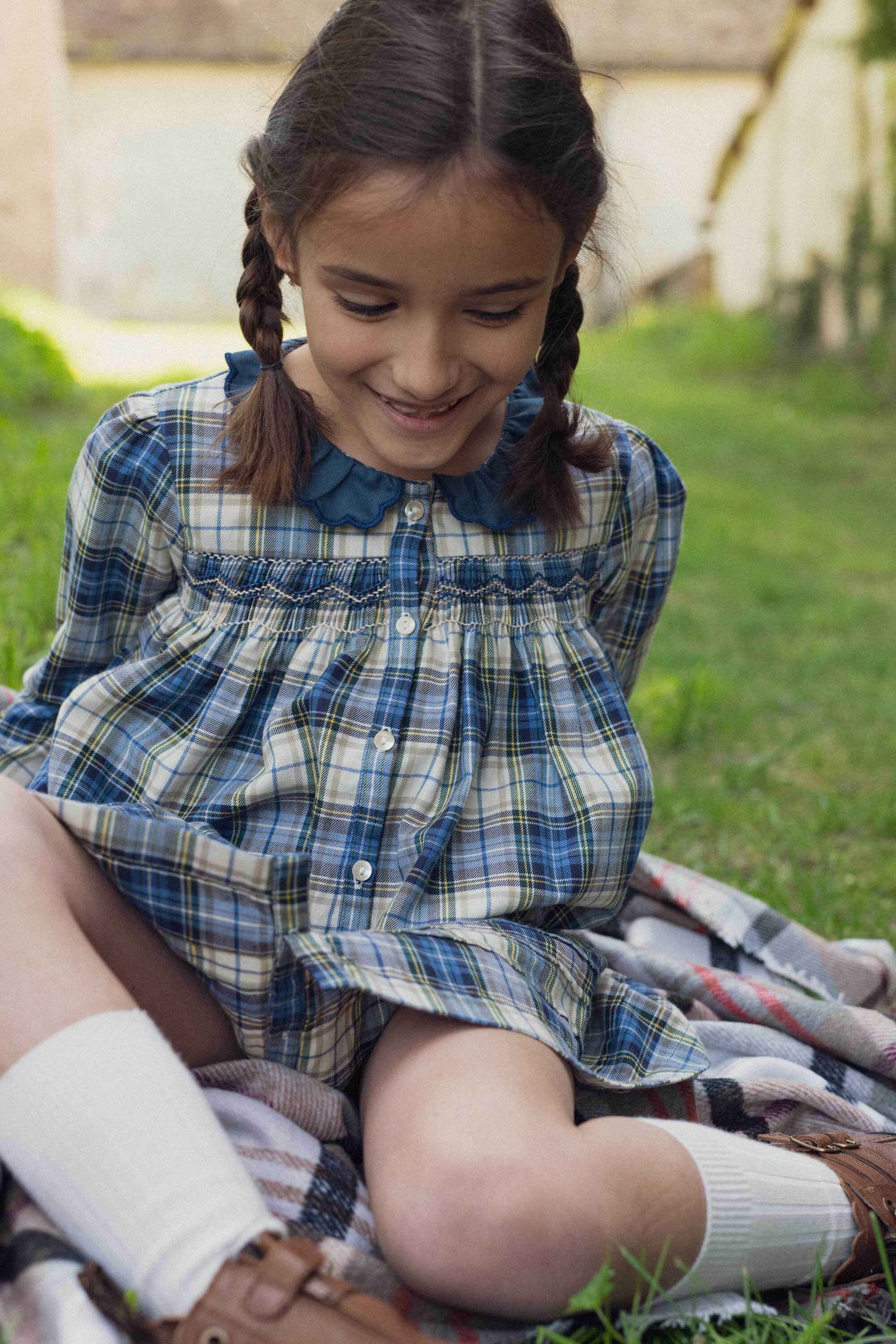 アマンダドレスは、動きやすさを追求したゆったりとしたフィット感と、胸元のスモックや刺繍が美しく、洗練されたディテールが可愛いタータンチェックのワンピースです。