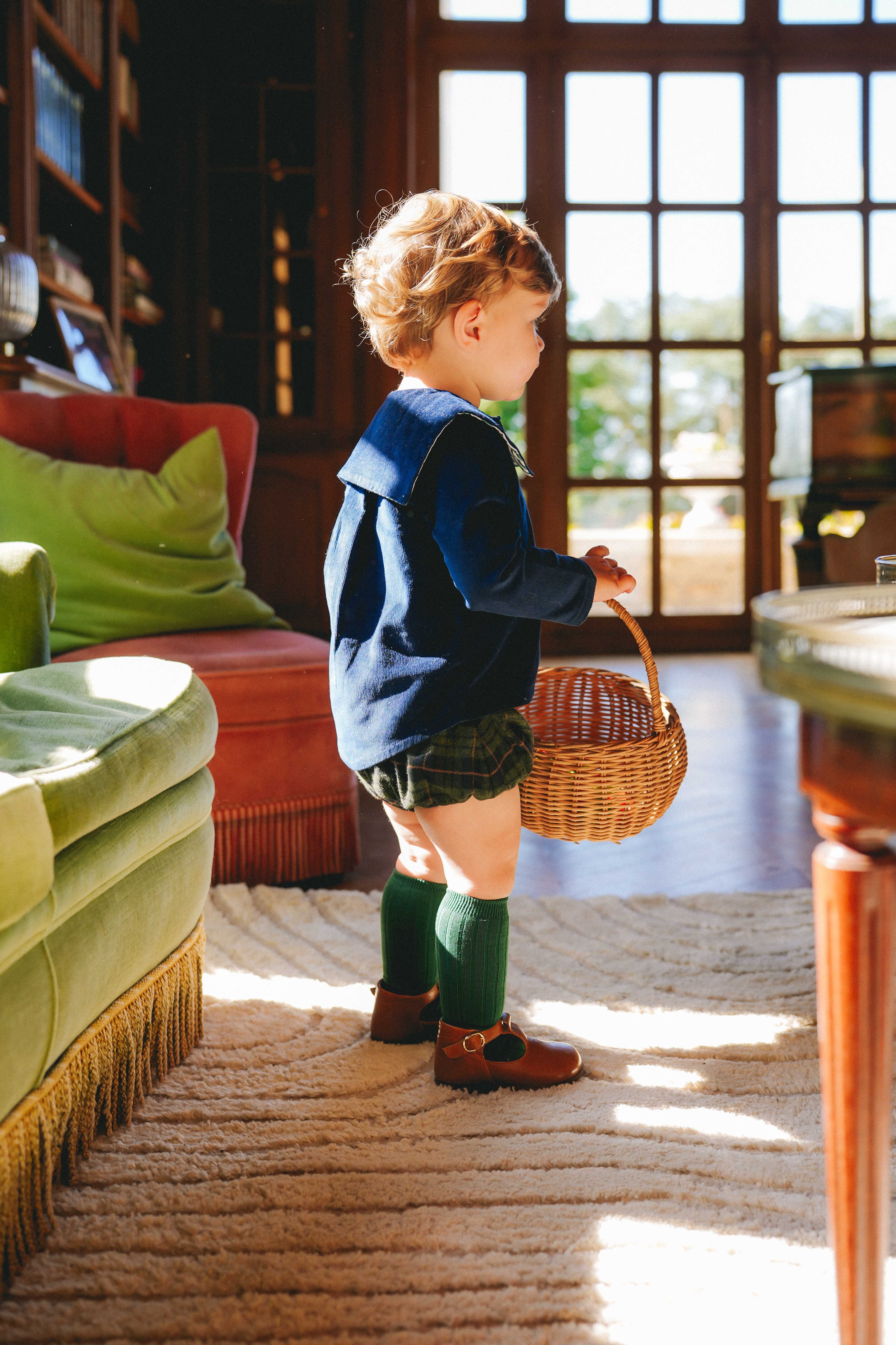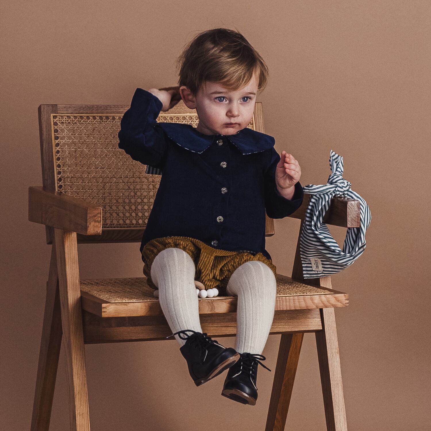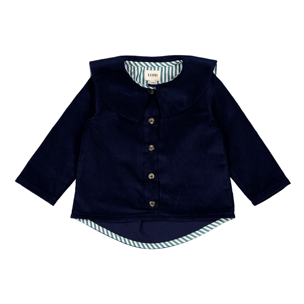 LORETTE は、繊細なネイビーブルーのコーデュロイベルベットで作られた、Loir定番のセーラーカラーシャツです。