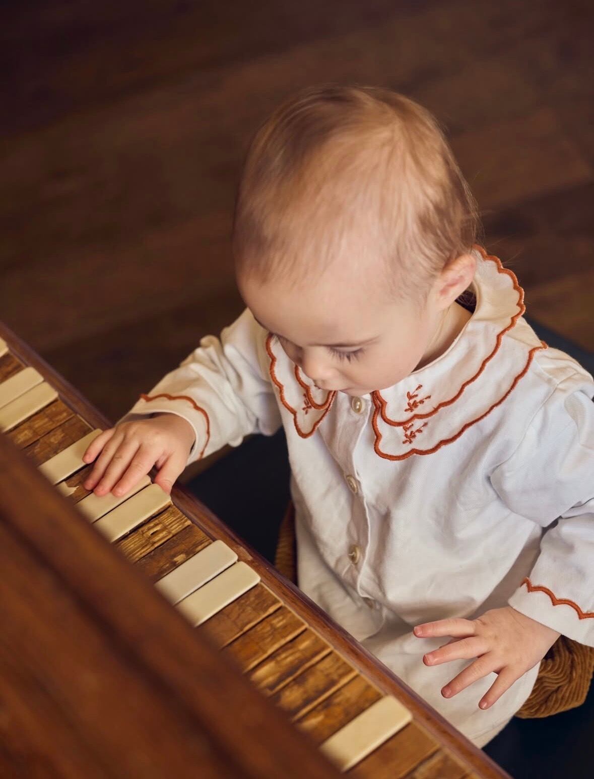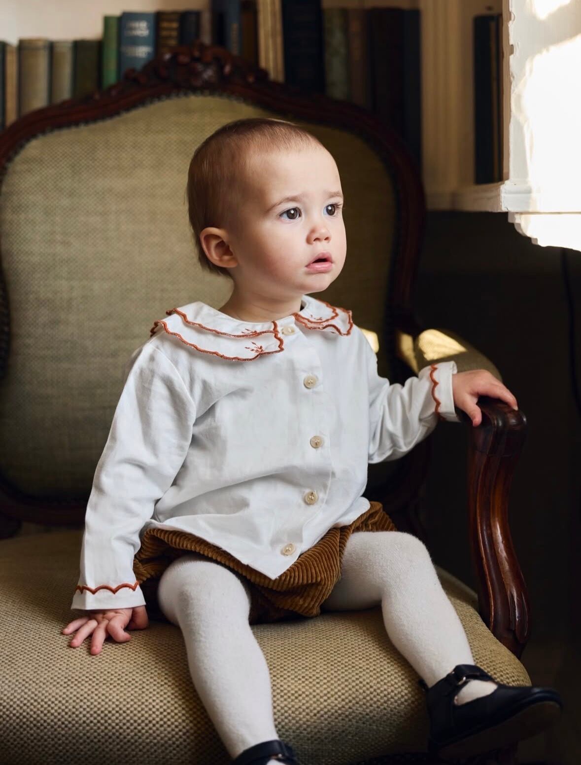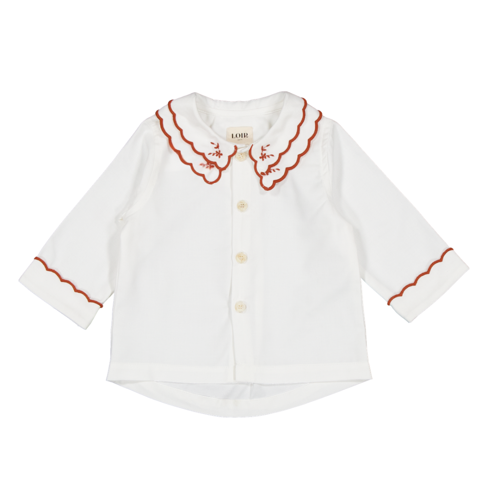 非常に柔らかい生地で作られており、テラコッタで刺繍されたダブルピーターパンカラーと、繊細なスカラップ模様と刺繍が施された袖口が目を引きます。