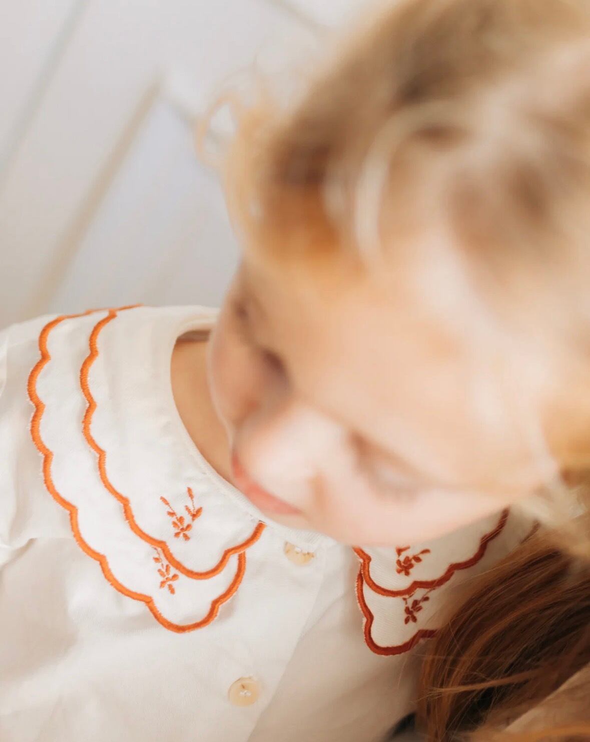 非常に柔らかい生地で作られており、テラコッタで刺繍されたダブルピーターパンカラーと、繊細なスカラップ模様と刺繍が施された袖口が目を引きます。