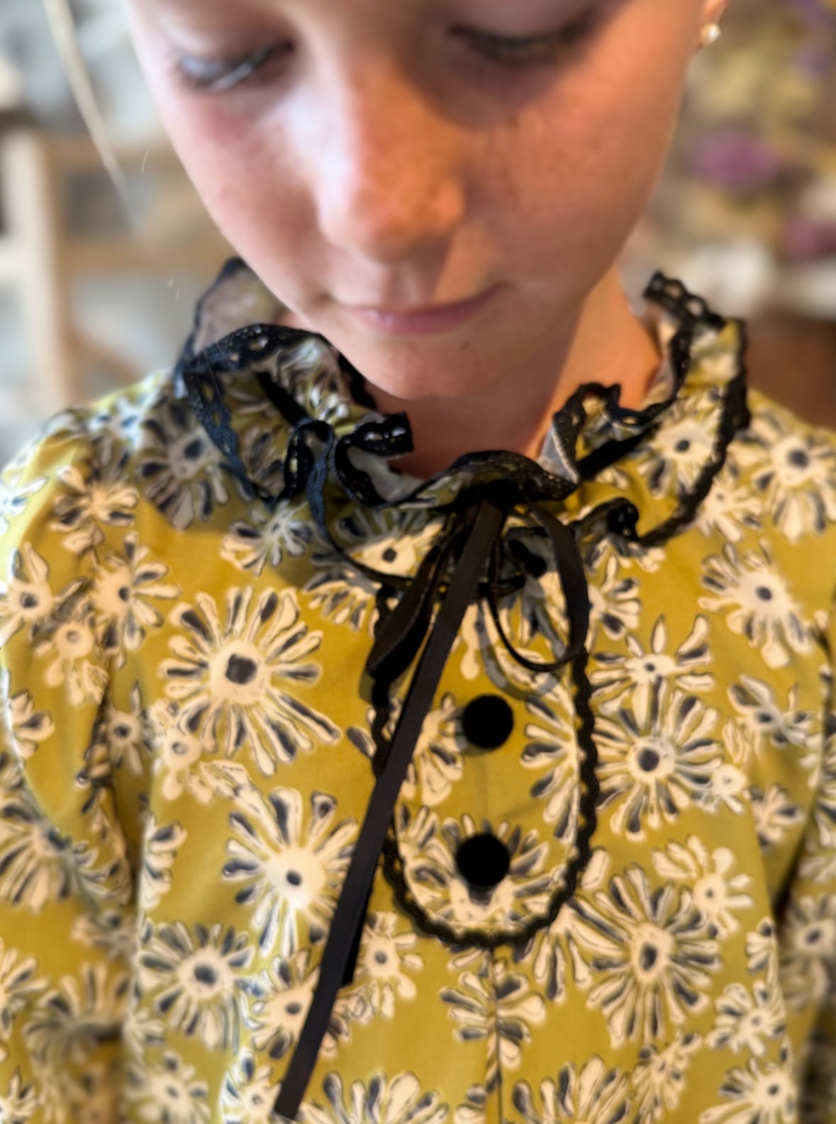 首元や袖口のフリルに黒のレースやベルバットリボンがついていて