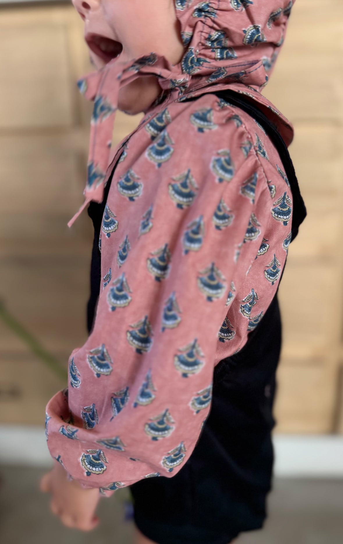 くすみピンクに少しレトロな花柄模様が季節問わず長く着ていただける一着です!