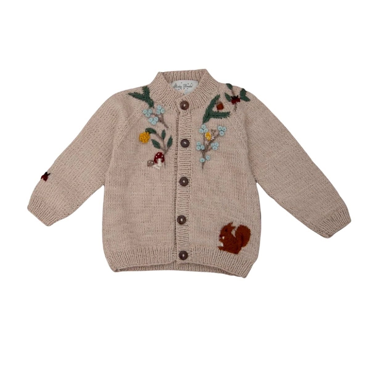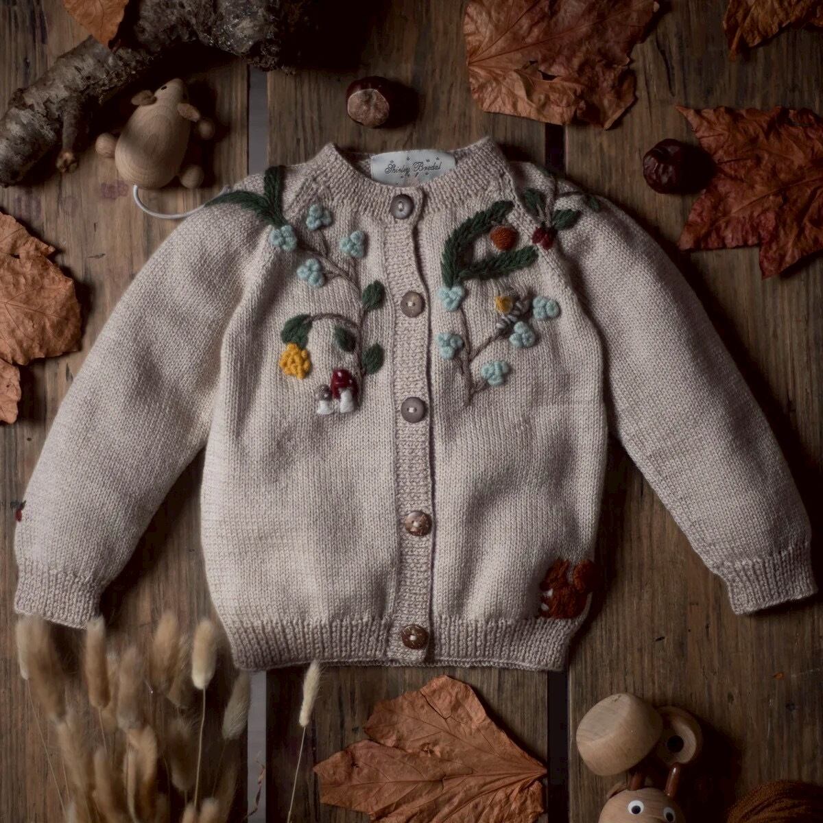 森の世界を思わせる小さなモチーフがちりばめられ、マルハナバチ、カタツムリ、そして愛らしいてんとう虫といった楽しいディテールが随所に散りばめられた、愛らしい一枚です。