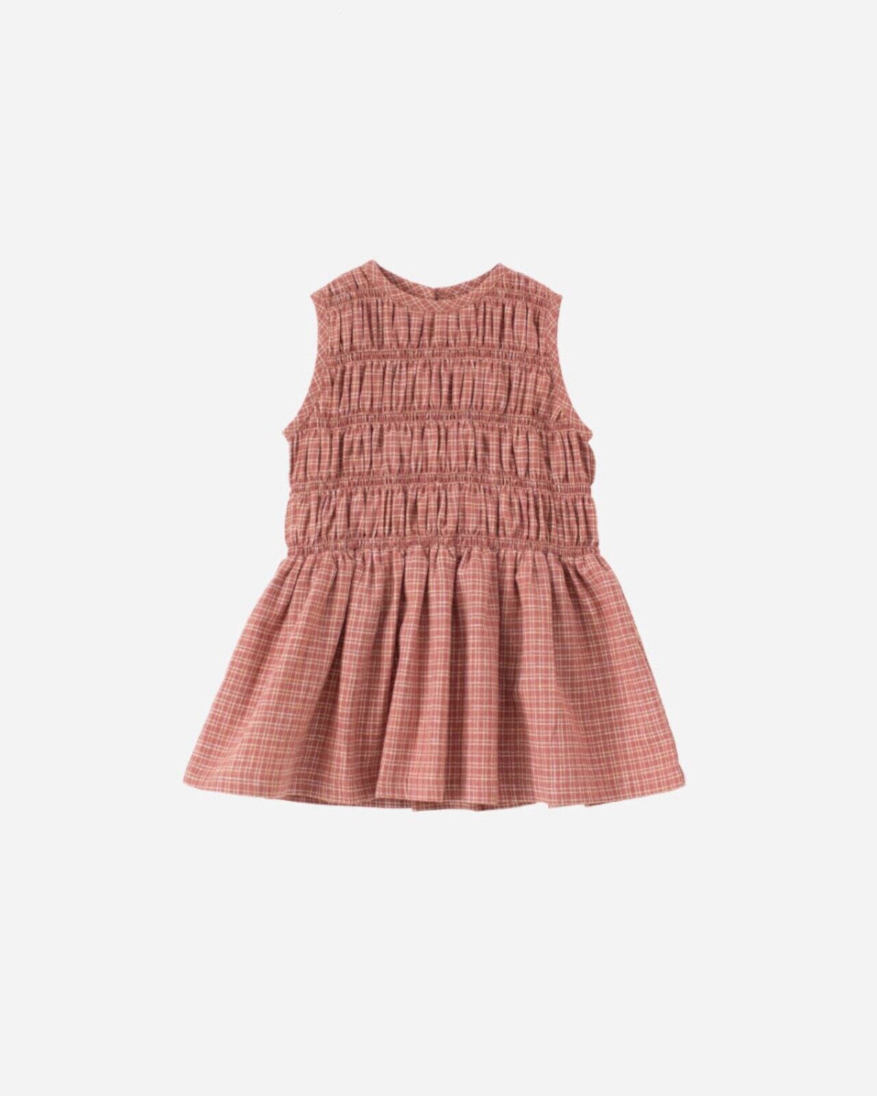 GOTS 認証生地 (麻 55%、オーガニック コットン 45%) で作られた、甘くて魅力的なノースリーブ ミニ ドレス。美しい糸染めの質感と色が人気です。
