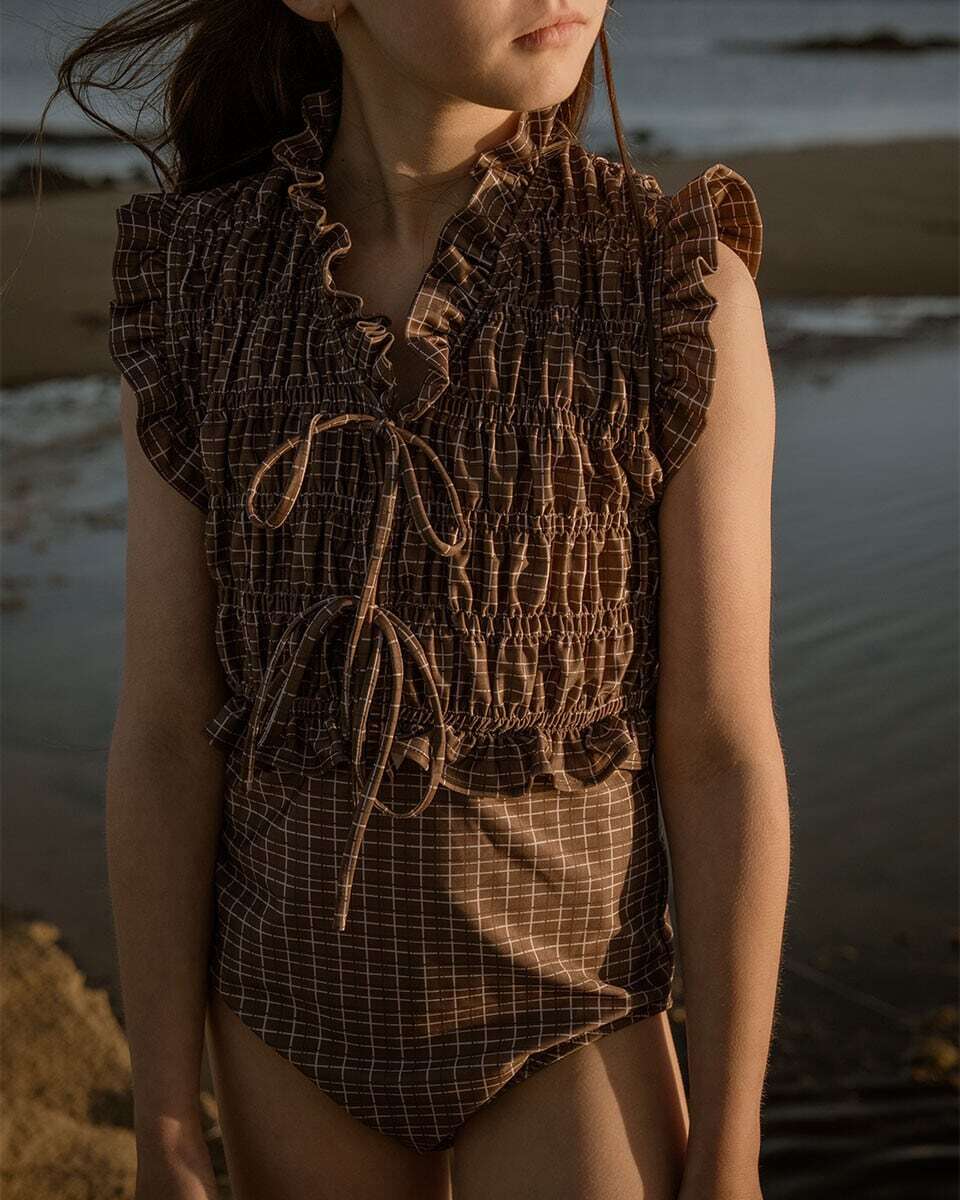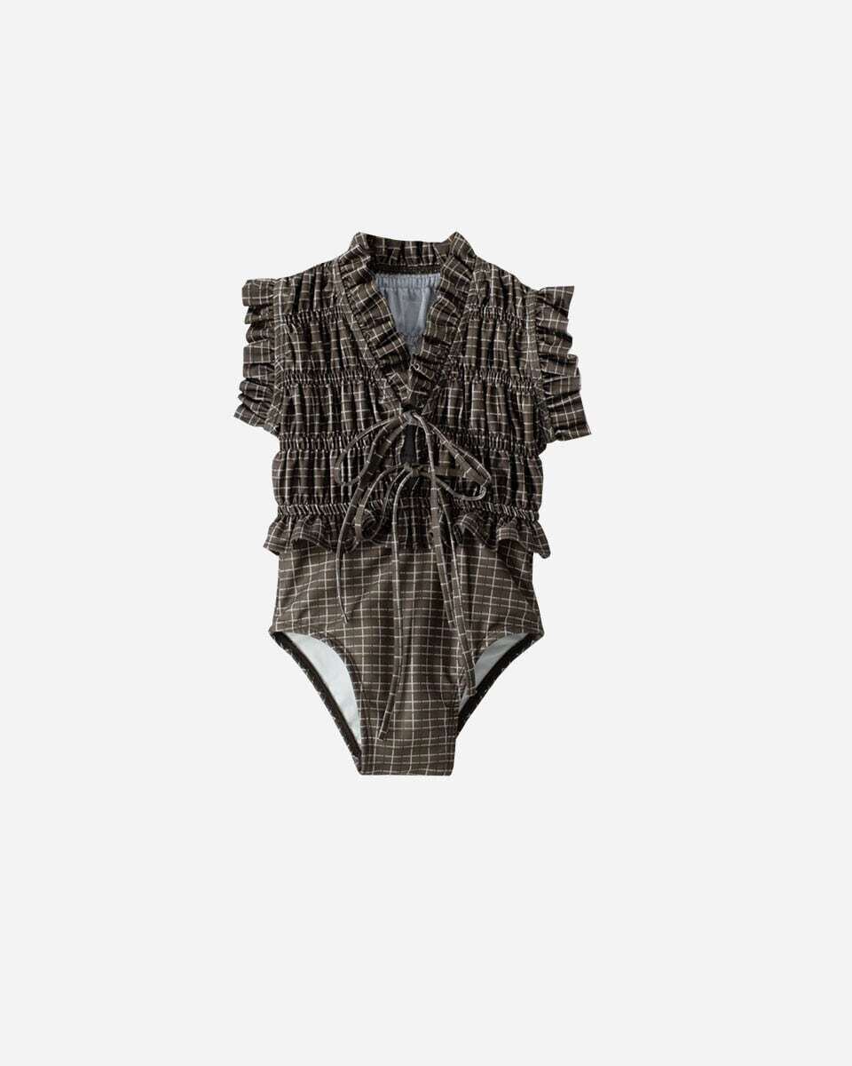 トップスから裾まで、甘美なディテールが光るワンピース水着。現代的なグリッドパターンと美しいスモック織りの質感が融合し、特別な装いと着心地の両方を叶えます。柔らかなフリルが肩とウエストを彩り、美しいシルエットを演出。フロントの蝶ネクタイが可愛らしいアクセントを添えています。