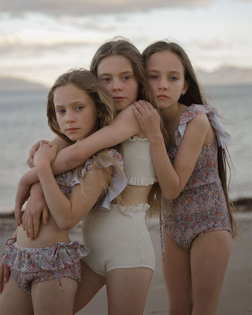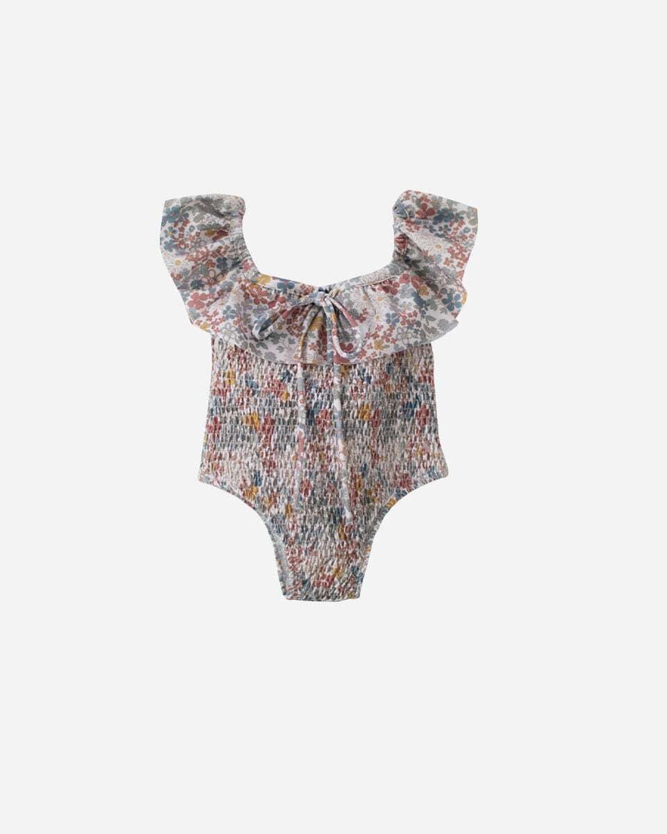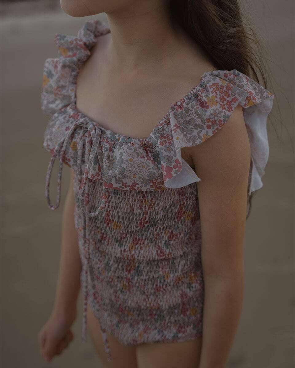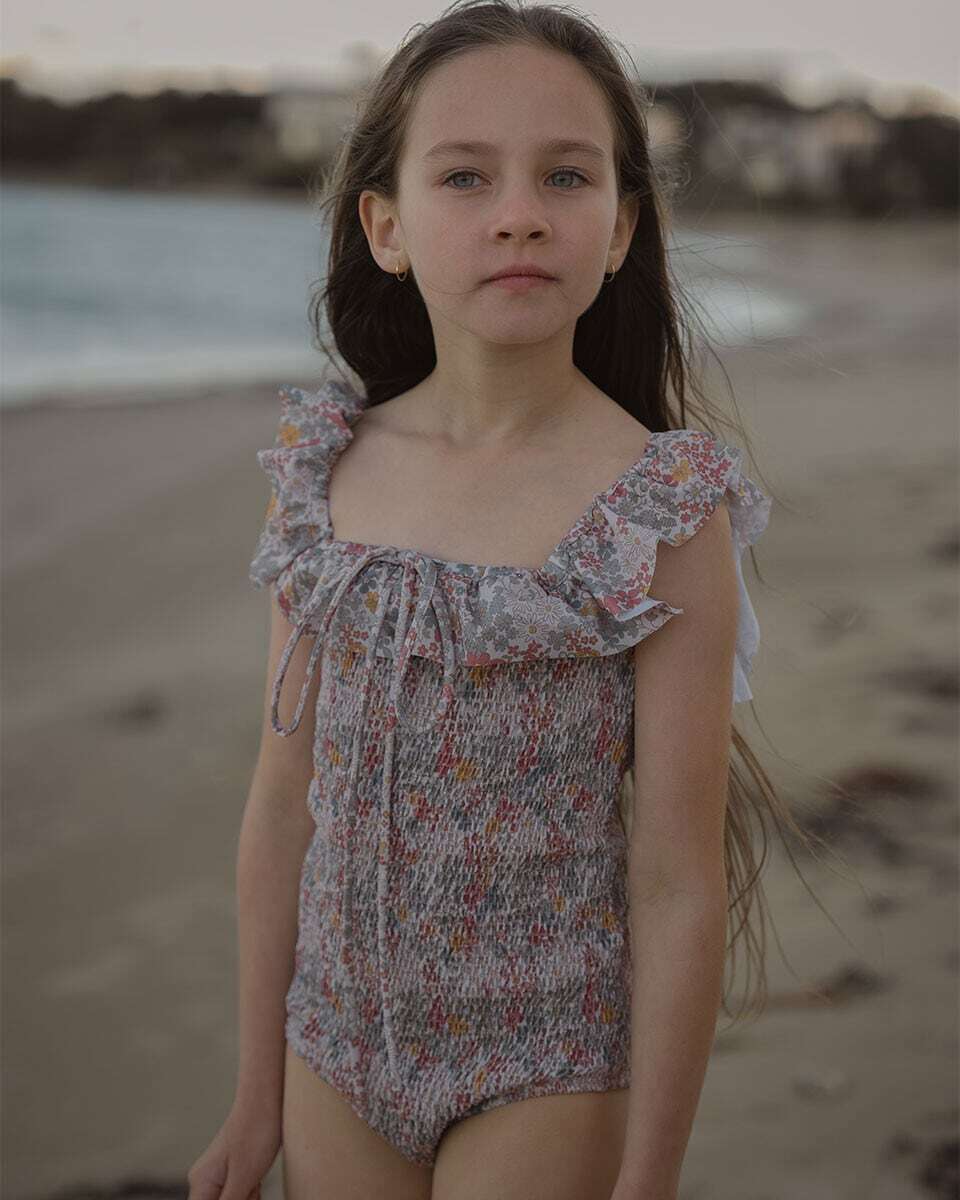 花々に包まれた太陽のような、そんな気分を味わえる水着。柔らかなブルー、温かみのあるイエロー、そして優しいレッドの色合いで、手描きのデイジーや小さな花々が咲き誇る、田園地帯の牧草地の魅力を捉えたフローラルプリント。才能あふれるフランス人職人によって特別に描かれたこの柄は、水しぶき一つ一つに、遊び心とノスタルジックなスピリットを添えています。